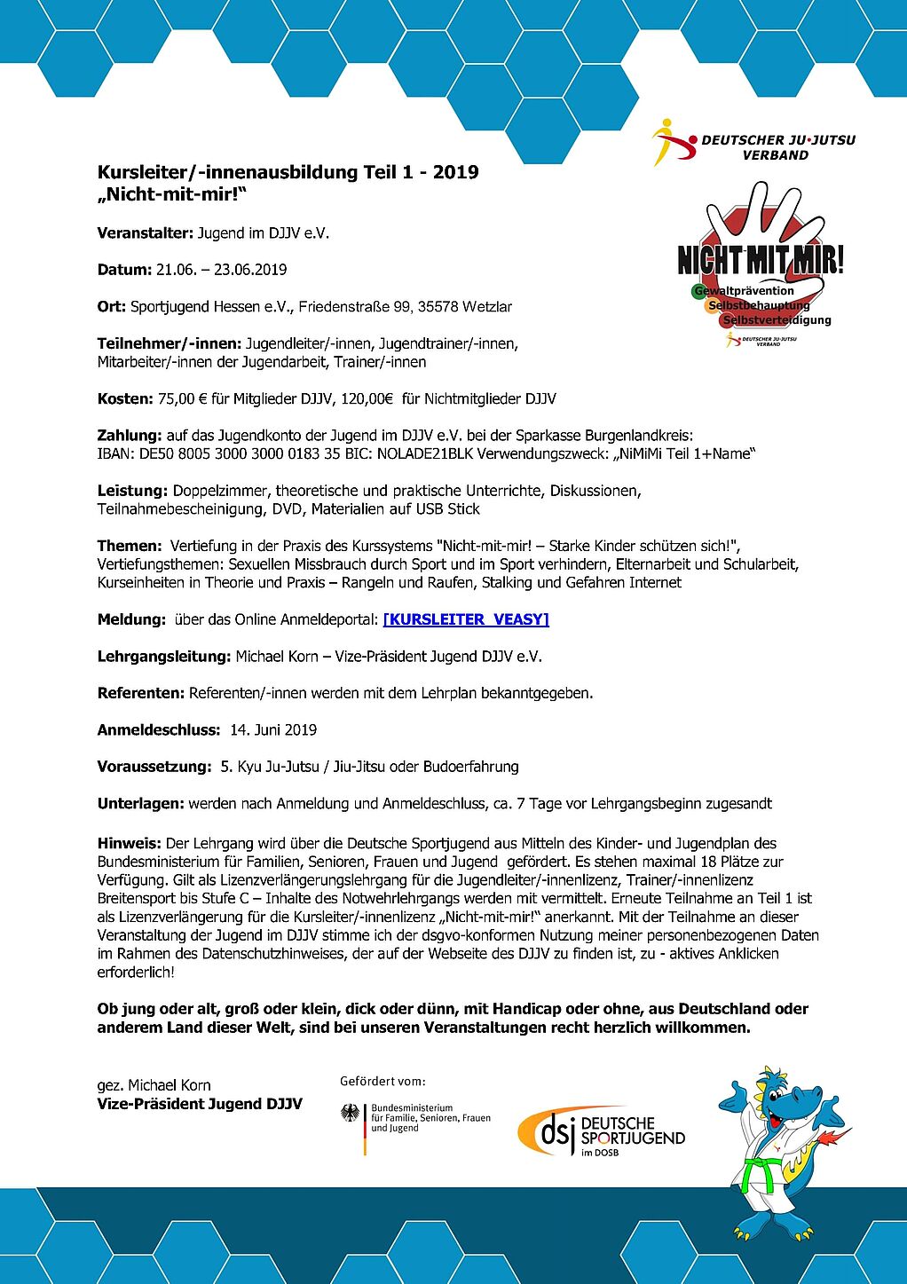 Wir haben noch wenige Restplätze für unsere "Nicht-mit-mir!" Kursleiter/-innenausbildung zu vergeben! Nutzt die Chance, um an möglichst vielen Schulen Selbstverteidigung & somit Ju-Jutsu zu vermitteln & Kindern zu helfen sich vor Gewalt zu schützen! Die Maßnahme wird durch die Deutsche Sportjugend (dsj) gefördert und kann somit zu einem sehr günstigen Teilnahmebeitrag gebucht werden! Anmeldung unter: <link http: djjv.veasyportal.de _blank external link in new>djjv.veasyportal.de/index.php; P.S. Mit erneuter Teilnahme könnt ihr eure Lizenz verlängern & kommt somit wieder kostenfrei an die Arbeits- & Begleithefte zu "Nicht-mit-mir!"!
