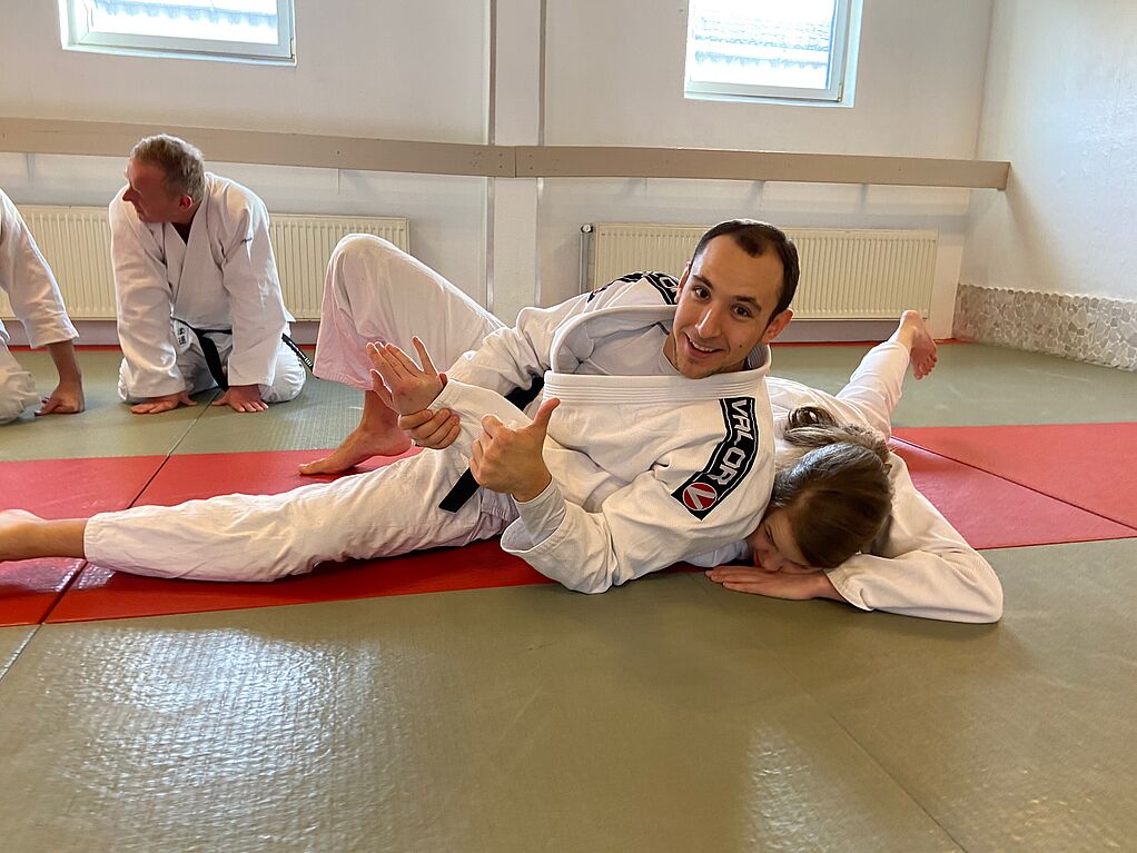 Das nächste Thema war der Übergang Stand/Boden, bei dem am meisten in der Gruppe diskutiert wurde, wie die jeweiligen Techniken zu beurteilen sind. Ausgehend von diesem Beispiel machte Jens deutlich, dass es auch für die Trainer wichtig sei, Prüferlizenzlehrgänge zu besuchen (auch wenn sie selber nicht prüfen), um die Schüler gezielter und korrekter auf die Prüfungssituation vorbereiten zu können.