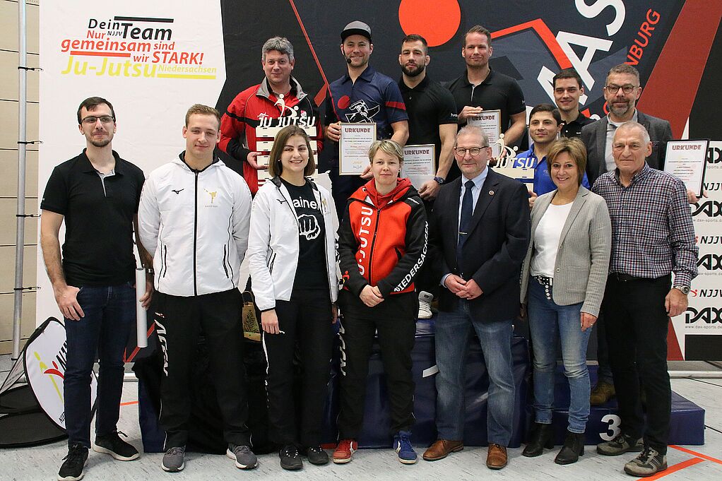 1. Vorsitzender des PSV Oldenburg, gewürdigt. Für die erbrachten Leistungen der letzten Jahre wurden Alex Siems (Ltd. Landestrainer); Christoph Garbrands (Landestrainer Fighting), Christian Teuber (Landestrainer DUO) und Michael Höflich (Sportdirektor) mit der Ehrennadel Leistungssport des NJJVs geehrt. Der NJJV-Präsident, Hans Radke nutzte das Turnier auch dafür, den bisherigen Verantwortlichen des Teams-Leistungssport persönlich und im Namen des NJJV Danke zu sagen. Er ehrte den scheidenden Sportdirektor Michael Höflich, den Leitenden Landestrainer Alexander Siems und den Landestrainer Fighting Christoph Garbrandts mit der „Goldenen Ehrennadel Leistungssport“ und den Landestrainer DUO Christian Teuber mit der „Silbernen Ehrennadel Leistungssport“. Unter folgendem Link sind alle Ergebnisse zu finden: <link https: www.jjx-mas.de ergebnisse external-link-new-window internal link in current>Ergebnisse X-MAS-Turnier Hier geht´s zum vollständigen Bericht: <link https: www.njjv.de news external-link-new-window internal link in current>LINK Medienteam NJJV
