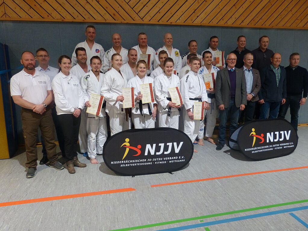 Damit alle Anwesenden das Highlight auch genießen konnten, begannen die anderen Prüfungen etwas später. Es hat sich gelohnt und alle waren anschließend begeistert. Sehr unterschiedlich die Darstellungen: einmal sehr traditionell, dann mit Musikuntermalung und sehr eindrucksvoll die Darstellung eines Sportlers aus Diepholz als Rollstuhlfahrer, Gehbehinderten mit Gehhilfen und Handstock und letztendlich als einseitig Armamputierter. Alle Darstellungen kamen sowohl beim Prüferteam als auch bei den Zuschauern überaus gut an. Über sechs Stunden liefen dann auf drei Matten die Prüfungen. Um es vorweg zu nehmen, alle Anwärter haben bestanden. Bei der abschließenden Urkundenübergabe an die Prüfungsteilnehmer fand Werner Thole als Vizepräsident Breitensport dann auch die richtigen Worte: „Ich hoffe, Ihr habt die zufriedenen Gesichter und das Lächeln der Prüfer gesehen, denn wir waren mit allen Prüfungen nicht nur sehr zufrieden, sondern außerordentlich zufrieden und von den Ausführungen vielfach überaus beeindruckt.“ Von den Prüflingen kam unter anderem das Feedback, dass es sehr begrüßt wurde, dass vor allen Dingen bei den Anwärtern zum 4. und 5. Dan mit dem sehr umfangreichen Prüfungsprogramm nicht „am Stück“ durchgeprüft wurde, sondern in mehreren Abschnitten, um die Konzentration und die Kondition nicht zu überstrapazieren. Das gute Ergebnis hat gezeigt, dass diese Regelung sich bewährt hat. Auch wichtig: außer ein paar kleinen Prellungen keine Verletzungen. Es haben bestanden: 1. Dan: